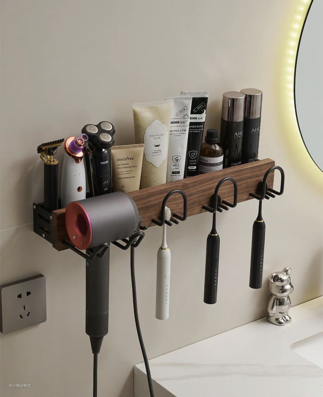 当然,,如果卫生间收纳空间有限,也可以利用这种水龙头上方的置物架,一根横版,就能把洗漱用品收纳个七七八八,而且置于水龙头之上,刚好避免了溅水风险,拿取还跟直接放在台面上一样方便。