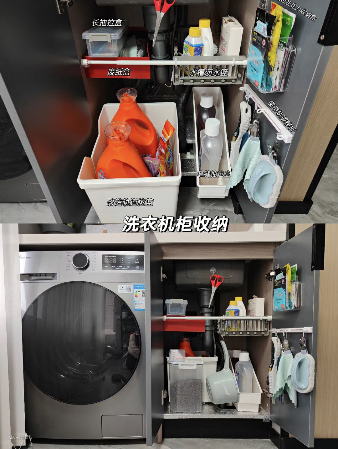 比如洗衣的清洁、柔顺剂,甚至洗衣机清洁剂,最好的放置位置是洗衣机周边;而垃圾袋放在垃圾桶旁边,方便更换;厨房小工具,整齐挂放,省去了翻找的时间。