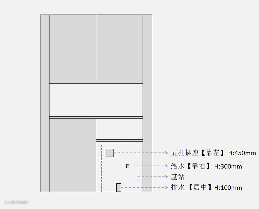 确认好位置了之后就需要预留水电,由于我的橱柜进深比较深有650mm,且左侧的柜子是预留的岛台净水器位置,在了解了科沃斯T20扫地机器人的机身尺寸之后我就把排水、给水还有下水管都直接设计在了扫地机器人后面的空间里面。下水管靠墙设计,扫地机器人与下水管前后并排摆放。这样便于把机器明装的摆放在空间里面,也不会把管线这些给露在空间里面。【PS:可能很多朋友会问我,为什么不做加柜门,做暗藏式的,岂不是更好看!科沃斯T20基站的外观设计简洁大方,白色和银灰色的搭配现代感科技感都十足,放在空间里面也是一种装饰】