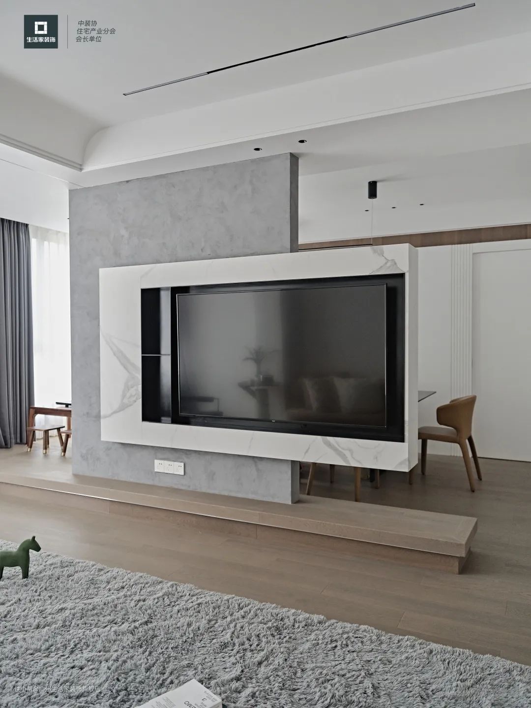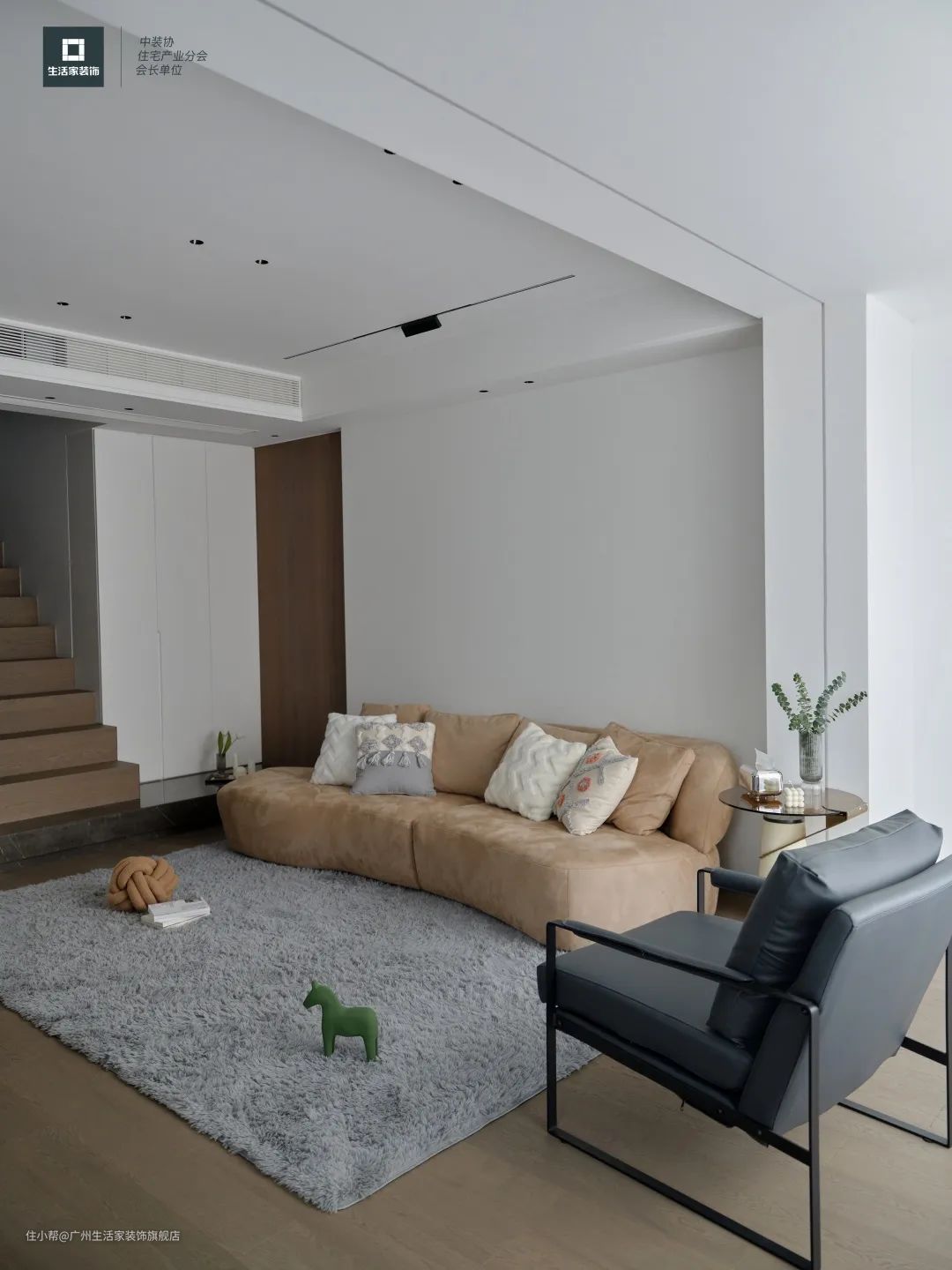 本案为复式住宅,以出自黑沉香的“伽罗色”揭开空山新雨后的清新全貌。朔风起,地始冻,料峭间林木荣逢春,自带湿润清冷的气息。