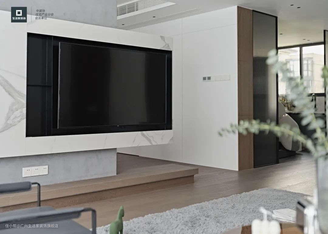 客厅以黑、白、灰为主色调,沙发背景墙则是白色的乳胶漆为底色,搭配胡桃木色的护墙板,既丰富了空间又达到一定的美观。