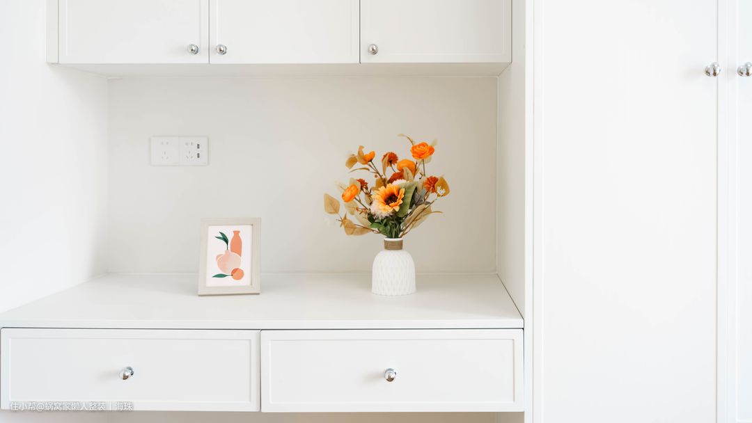 利用墙面之间之间的空隙巧做嵌入设计,在视觉上不显突兀,同时又能容纳主卧的衣物存储,但卧室小在设计柜门时尽量采用浅色和无拉手、隐形拉手或精巧小拉手设计,让大柜整洁时尚大气不显压抑。
