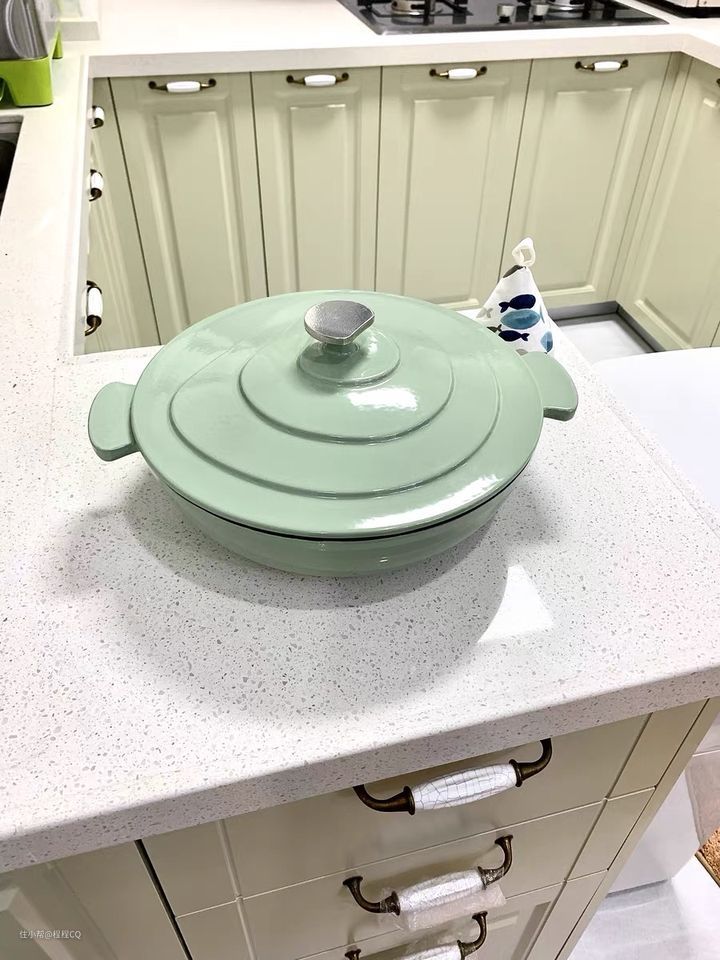 我买的这款是28cm大口径的珐琅锅,因为平时最喜欢的颜色就是绿色,所以果断下单了浅草绿的这款,不得不说真的买到了心坎里,不仅看着养眼而且相当方便。