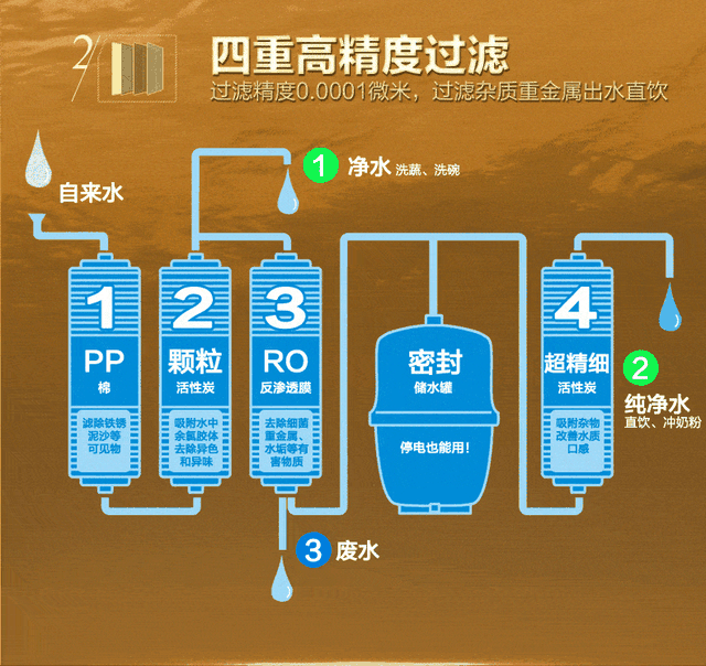 采用双芯多重过滤,过滤精度达到0.0001微米,可以将水中的杂质、细菌、重金属等一网打尽,除菌率99.99%