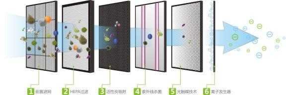 目前市面上大多数产品多采用复合多重过滤材料,初筛过滤网(拦截毛发、大颗粒物)HEPA滤网(小分子颗粒、PM2.5、尘螨等)活性炭(吸附甲醛、异味)紫晶(分解甲醛)负离子杀菌等。(注:不同产品使用的过滤层有所差别)