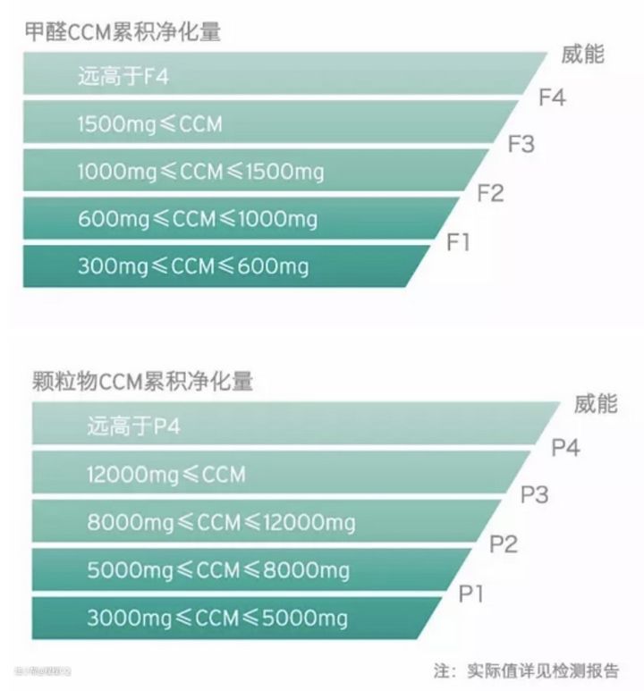 CCM指的是空气净化器累计净化量,它与滤网的使用寿命和净化效果直接相关,数值越大,滤网持续使用时间越长,后期更换滤网的成本就低。 同样,CCM值也分为颗粒物CCM值和甲醛CCM值,并且分别细分为4个等级。