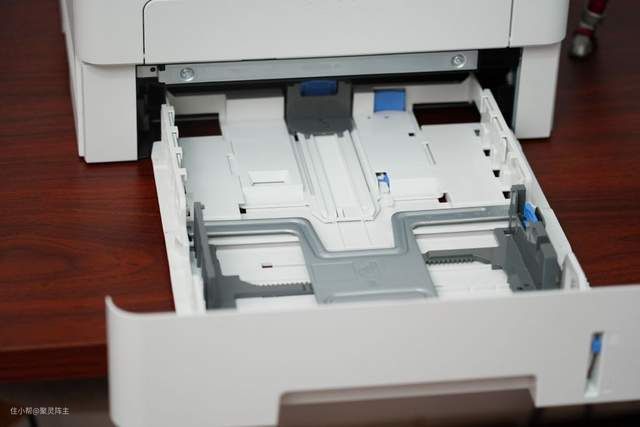 打印机的纸盒位于机器最下端,它支持多种不用类型的纸张,打印之前只需根据所选纸张的尺寸对纸盒进行简单调整就可以了。这一点感觉有点那种大型专业打印机的味道了。