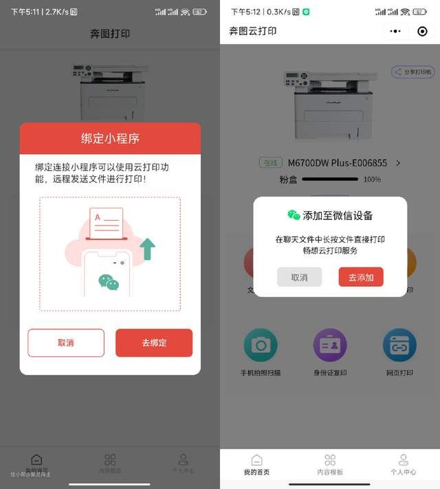移动端连接成功后可以选择绑定微信小程序,将其添加至微信设备后不仅可以将打印机的全部功能都在微信小程序中显示,使用,还可以将打印机分享给微信好友,让他们直接可以打印。