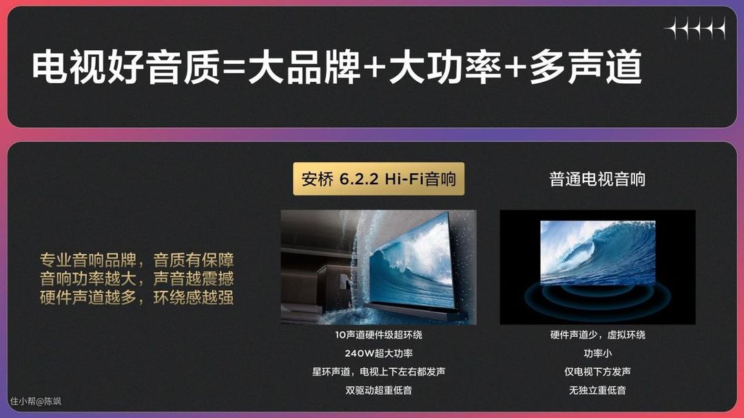在音质层面,其使用了可能是目前液晶电视配置里的最高级别——安桥6.2.2 10声道HiFi音响,峰值功率240W,星环声道,超重低音,巅峰音质,绝对让你用耳朵就能听出和其他电视的区别。