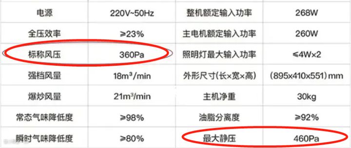 风压:影响抽油烟机排烟效率的主要因素,相比风量大家更应该关注风压,风压分为标准风压和最大静压两个数值指标。
