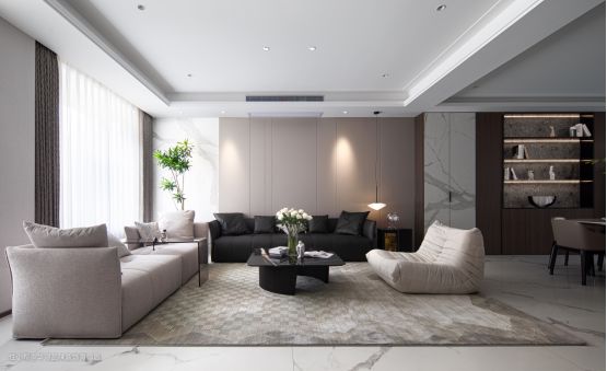 整体以高级灰为主调,并辅以木料、岩板和皮革等材料,通过丰富的材料和形态营造空间层次与质感。整体设计简洁大方,没有过多的装饰,却处处彰显品质感。