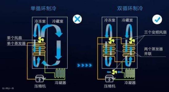 而双循环系统的冰箱,冷藏室和冷冻室的蒸发器和风机各自独立(两个蒸发器、两个风机)使冷藏室和冷冻室可以有效地分离,独立的运行。无论是品质还是性能,都比单循环系统的冰箱更好。 三循环,也叫多循环,有三个蒸发器和三个风机,分别负责不同的温室。建议在选择循环系统时,尽量选择双循环或多循环的,后期的使用体验感会更好。