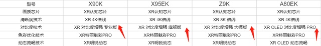 "XR":XR表示表示该型号带XR画质芯片,2021年开始中高端型号开始标配。定位稍低或者之前未采用XR芯片的电视前缀为KD或者KDL,其中KD表示4K分辨率电视,KDL表示1080P或者2K分辨率电视。