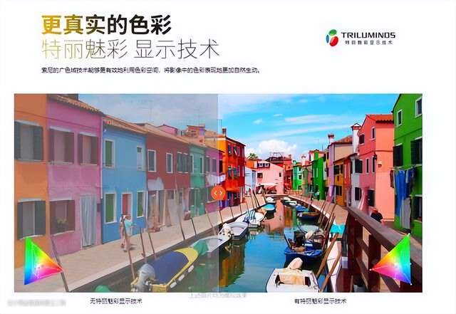 早期的特丽魅彩其实就是一种广色域技术,也就是现在不少厂家宣传的量子点技术(光是这一点已经领先对手数年)。现在采用的特丽魅彩除了显示更多色彩之外,更能实现色彩的准确显示。不仅带来了宽广的色域表现,而且也能准确的进行色彩还原,实现更加自然的显示。