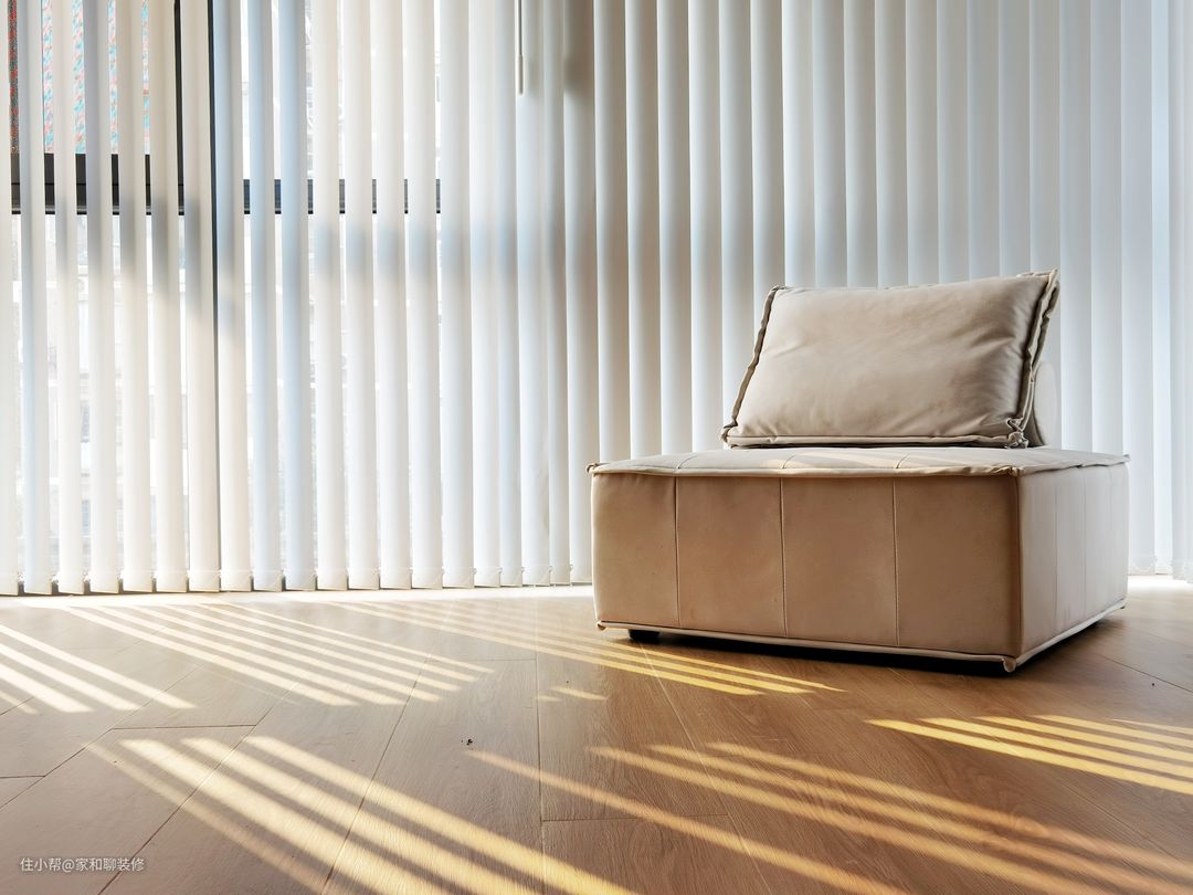 如果客厅和阳台的面积都比较大,且封了阳台的情况下,可以选择在阳台装一层白色金刚纱或者幻影纱,遮光帘安装在客厅。客厅和阳台空间足够开阔,两个空间可以单独使用,正午拉起阳台的窗帘可以有轻微的遮光作用,但不影响屋内正常采光,实用又有氛围感。