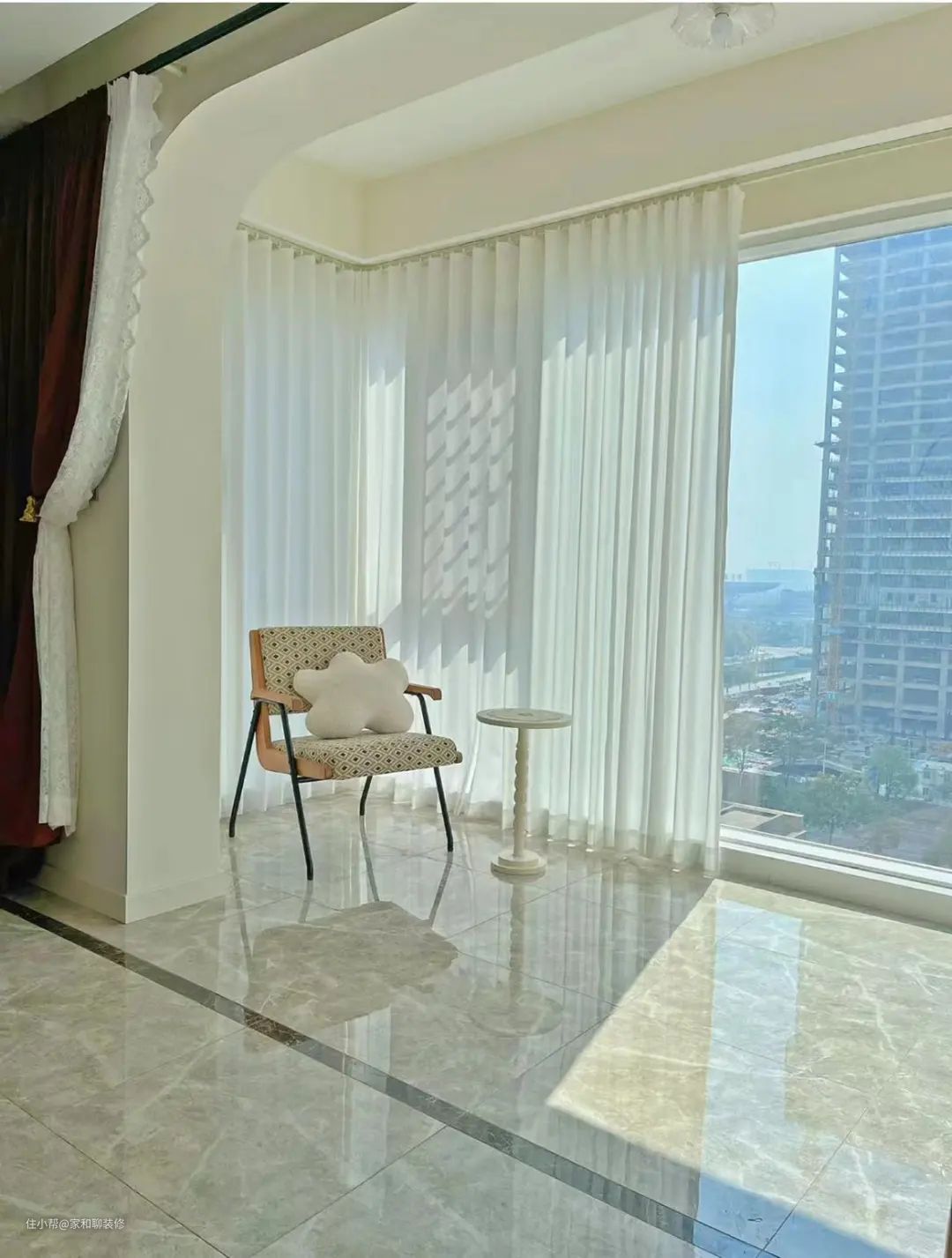 5、窗帘一般做满墙更好看,除了飘窗比较特殊,可以根据飘窗大小选择整墙窗帘,或者飘窗比较小可以贴近窗户的位置安装。