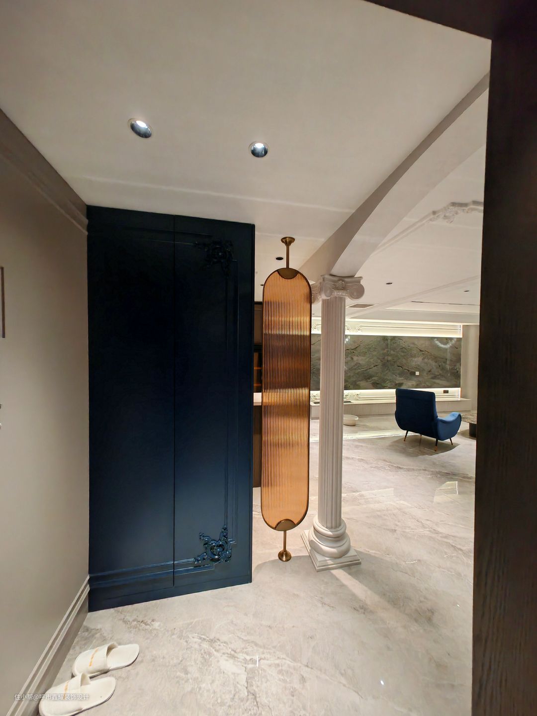 厨房空间与岛台都以白色大理石装饰,与客厅背景形成强烈对比。厨房的轻奢质感,显示出一种毫不拖泥带水的干练。门厅白色罗马柱,华丽时尚的现代精致的灯饰与现代的融合,几乎无缝衔接
