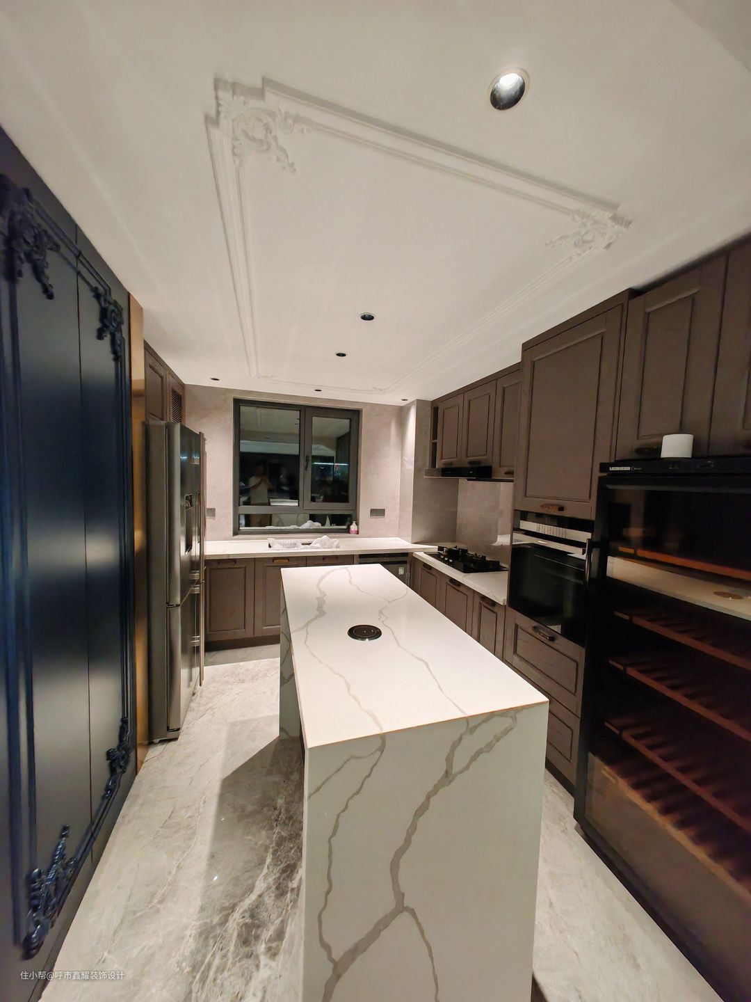 艺术一点,是高级、是内敛、是干净利落。搭配暗色系木质橱柜,金属等不同材质后,让整个厨房空间变得更有层次,再加上灯光造型的加持,全案设计营造出一个高级神秘的氛围