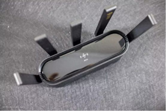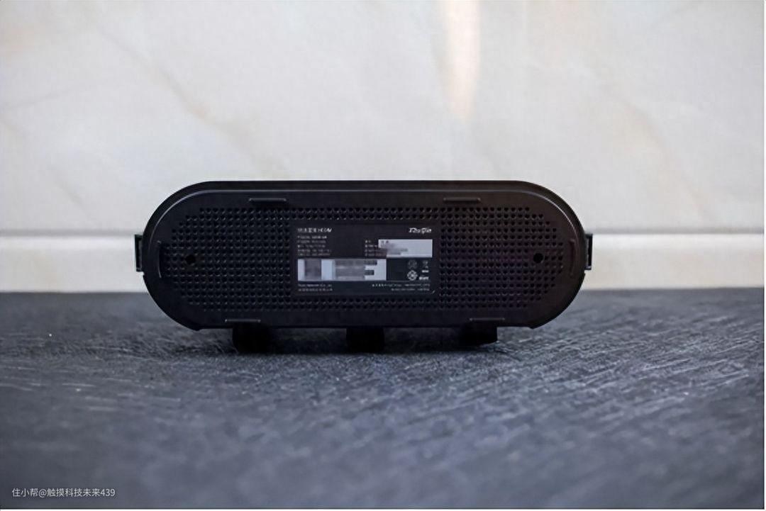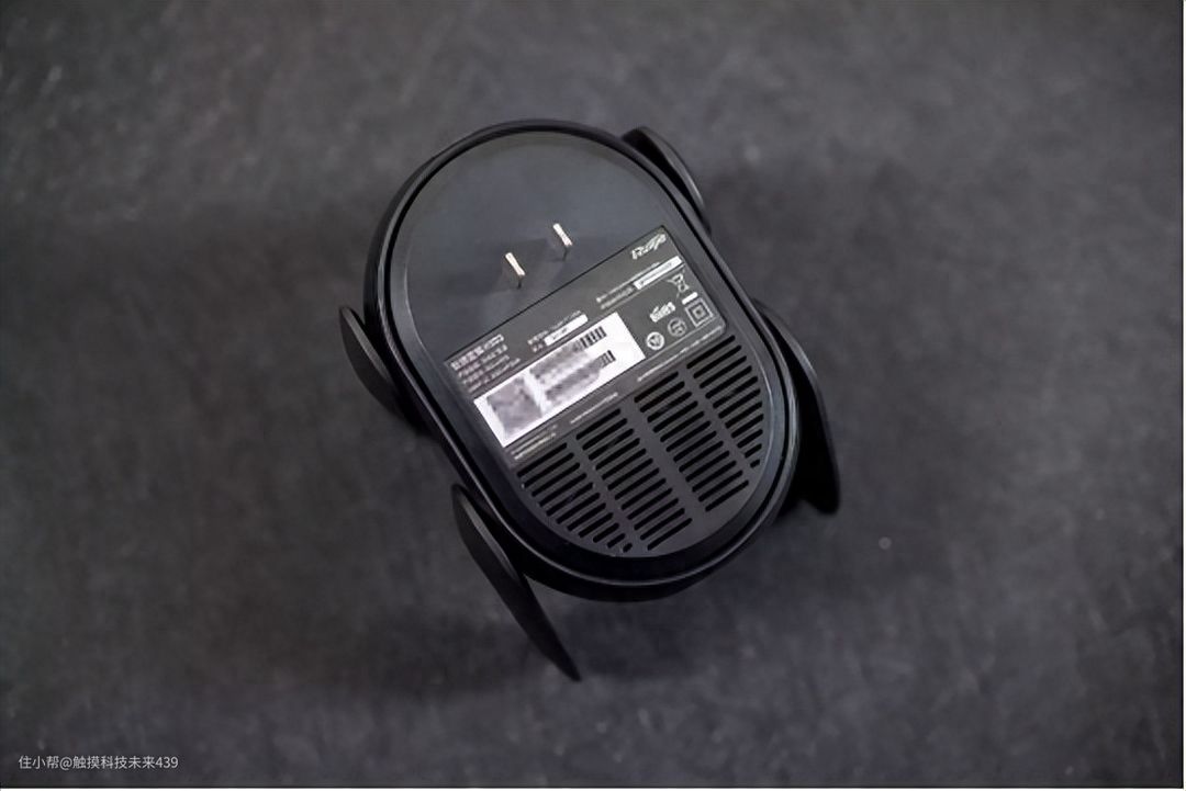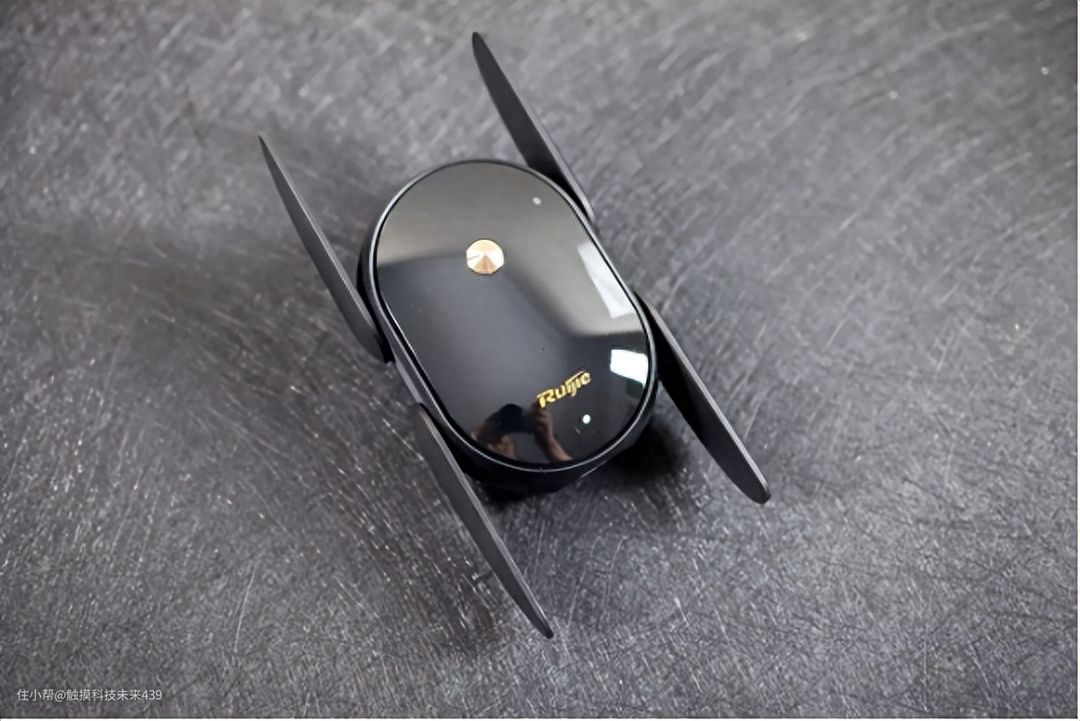 锐捷蜂鸟旗舰版母路由器的顶部是镜面效果的,质感很棒,但是容易留下指痕和灰尘,顶部中间有个类似闪电图标的感应区,可以和子路由实现碰一碰自动配对的功能。