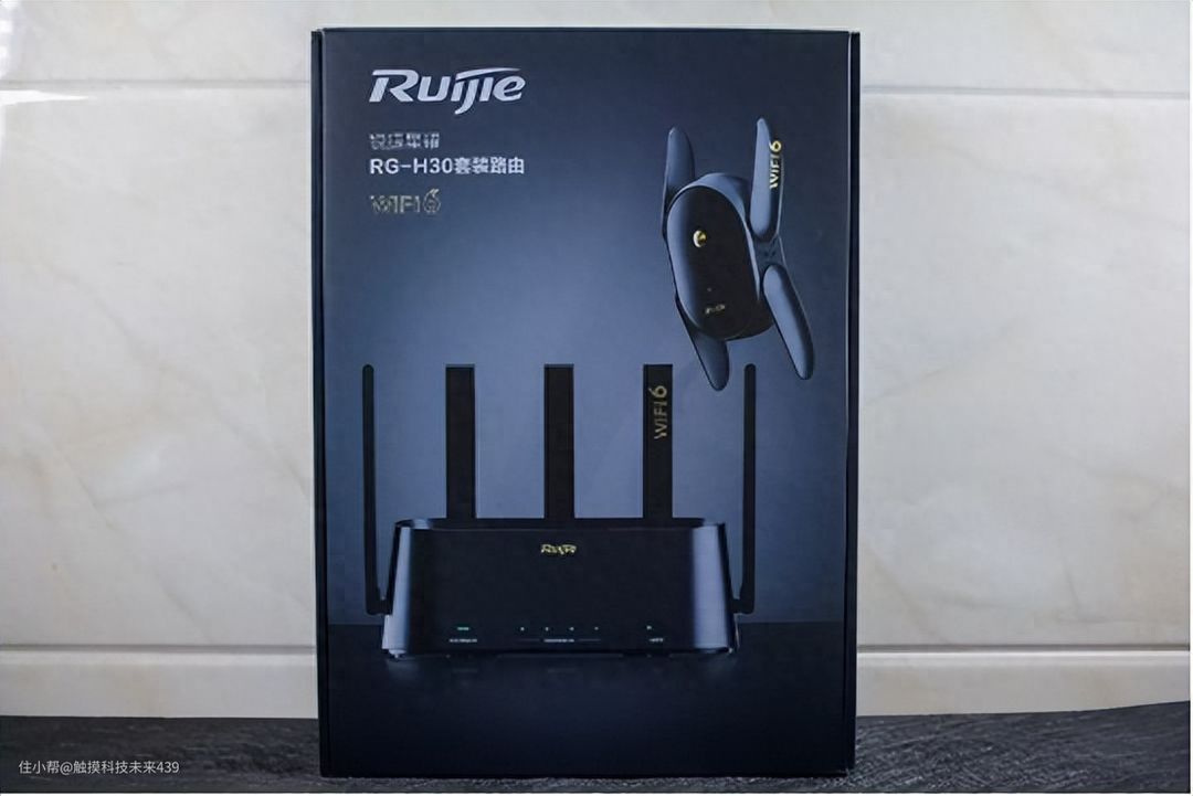 锐捷蜂鸟旗舰版子母路由器 H30的包装盒不小,左上角印有锐捷的品牌Logo和产品型号,下方印有子母路由的渲染图。