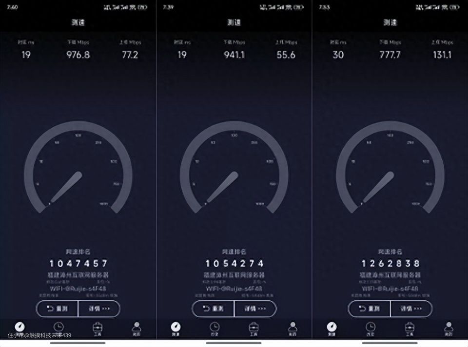 接下来就是最重点的网络速率测试了。第一点位于锐捷蜂鸟旗舰版母路由器旁边,信号自然是最好的,所以测试所得速率是976.8Mbps。第二点在门口,与母路由器较近,且没有遮挡,所以测得速率是941.1Mbps。第三点位于侧卧边角,与母路由器和子路由器都隔着一堵厚墙,不过子路由器相对于母路由器要更靠近一些,测得的速率比较低,仅有777.7Mbps,但是比之前路由器的效果要好多了。