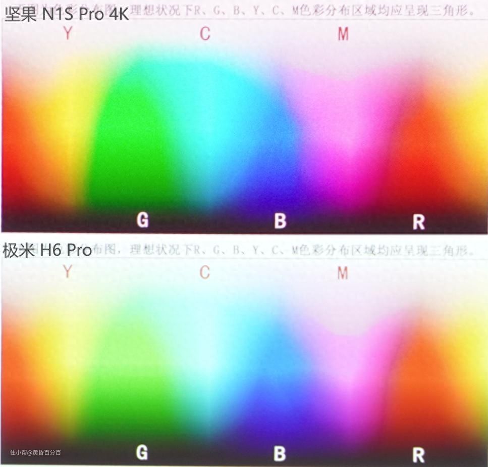 ▲最后我们再来看一下色彩分布图,可以明显看出,坚果 N1S Pro 4K的三角形轮廓更清晰,而极米 H6 Pro在绿色、蓝色、紫色的三角形则比较模糊,有的浅蓝与紫色的三角形也有明显凹陷。