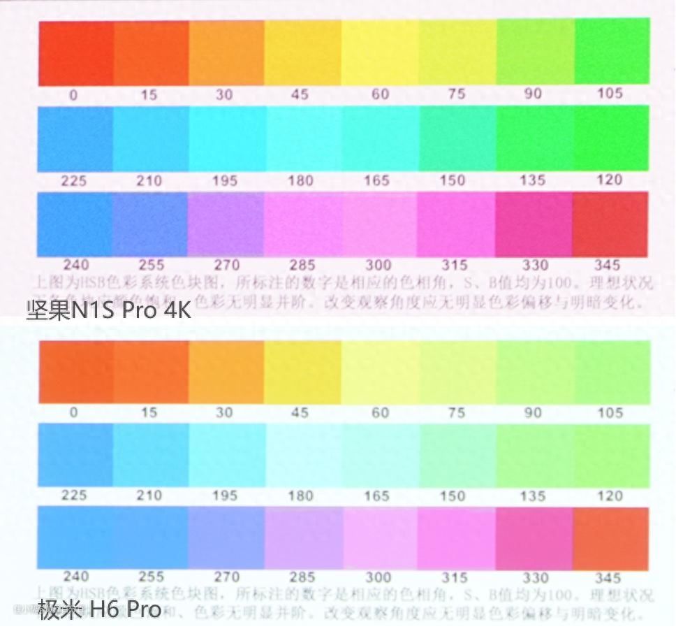 ▲我们再来通过色块图来进行一下比较,从图中可见坚果 N1S Pro 4K 的画面色块之间相对而言更加泾渭分明,比如在90与105、135与120、240与255这三组色块之间,坚果 N1S Pro 4K 画面色块间隔可以说是泾渭分明,而极米 H6 Pro的色块间隔则略微模糊不清,稍难辨识。
