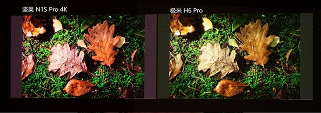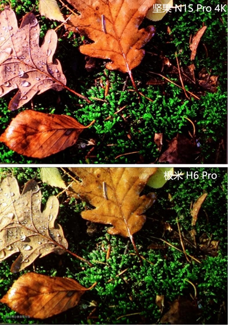 ▲在这张落叶与嫩芽的图片中,两者的细节表现都已经很好,不过坚果 N1S Pro 4K画面右下角的落叶要比极米 H6 Pro的更明显一些,可见对比度上的优势,使坚果 N1S Pro 4K的暗部细节更加出众。