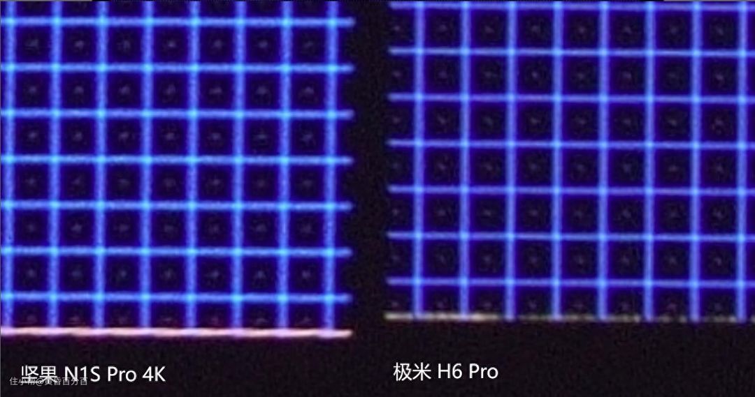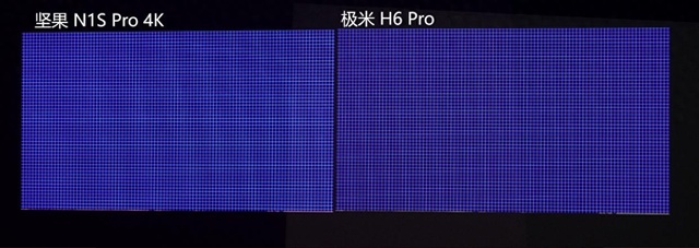 ▲两款投影仪的画面解析度不分伯仲,变现都不错,均能够看到网格内的圆点,在此图中,坚果 N1S Pro 4K的亮度稍高。