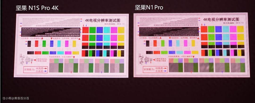 ▲首先,在远处观看4K分辨率测试图,两款投影仪表现都还不错,不过左侧坚果N1S Pro 4K相较于右侧,看上去还是要清爽不少的。