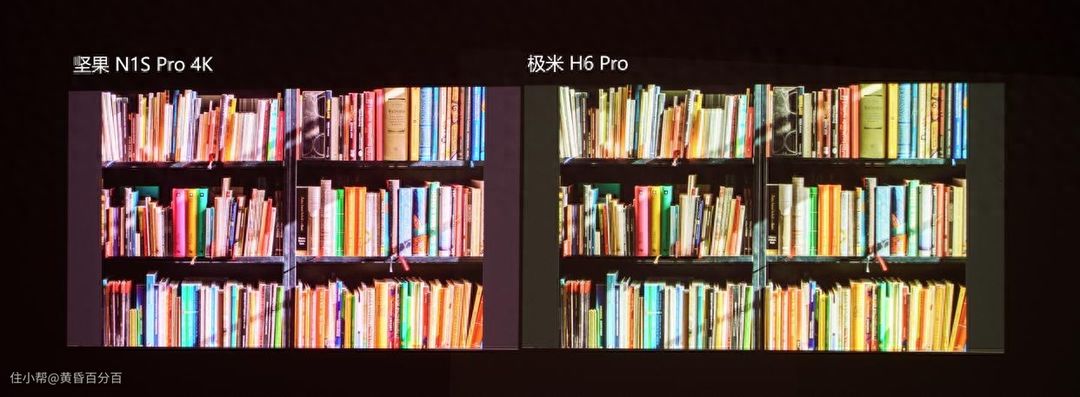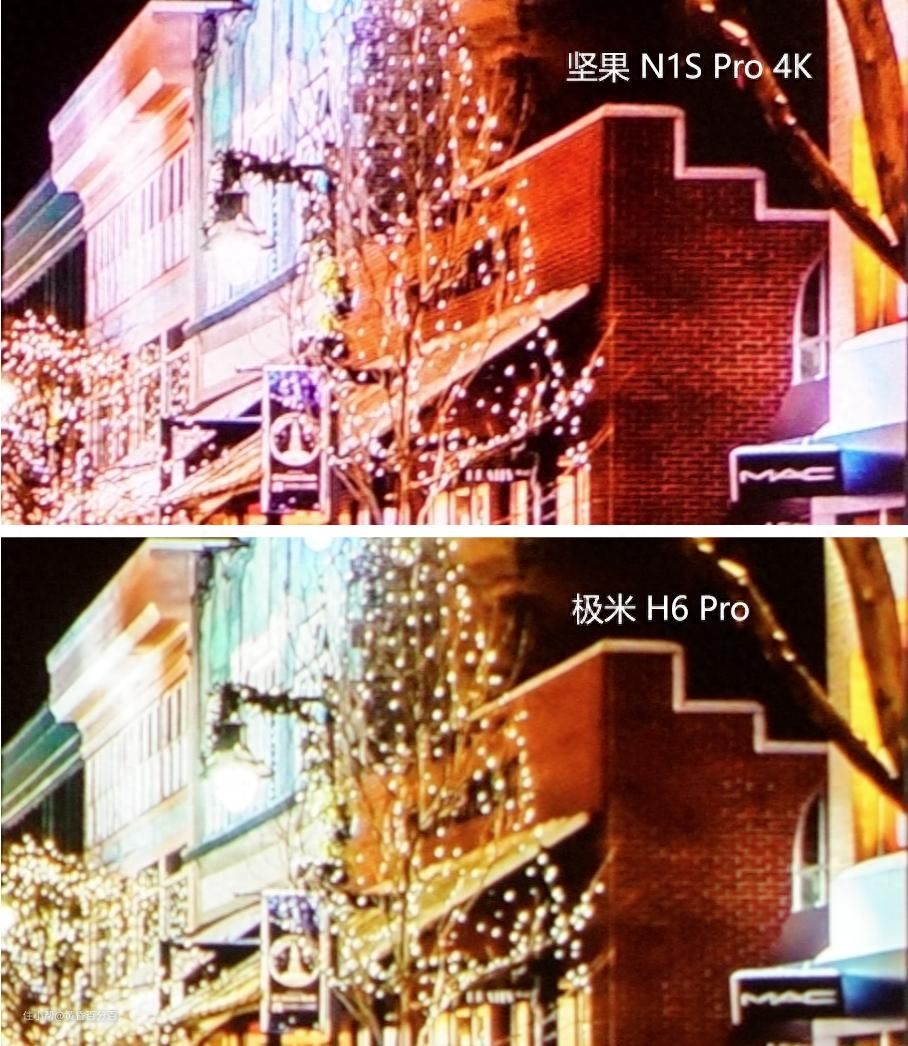 ▲亮度提高带来的好处非常明显,其不同颜色之间的差异更加明显,且图片底部的小字体文字,虽然两张图都能辨识,但是4K分辨率的坚果 N1S Pro 4K的字体更加锐利清晰。