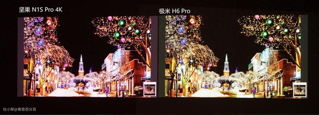 ▲再来看一下这张圣诞夜景图,直观看上去,左侧坚果 N1S Pro 4K的对比度更强,画面更具张力。