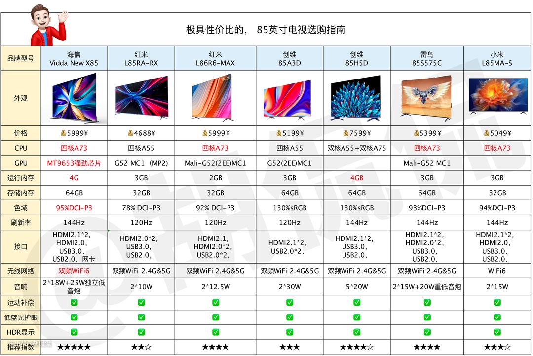 这里给大家推荐, 💰5-6K元这个价位段,七款款高性价比机型,这些机型都是极具竞争力的产品, 如果你也恰好在选择85英寸电视, 那么这篇文章可以帮助你在选购路上不踩坑。