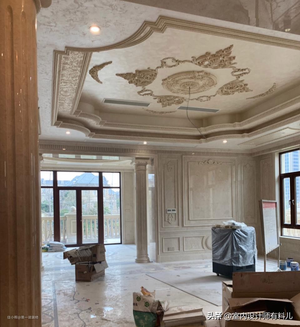 近几年流行的法式风格在回字形吊顶的基础上还加上了灯盘、石膏线、角花等,第一眼真是心动,满满的法式宫廷风。