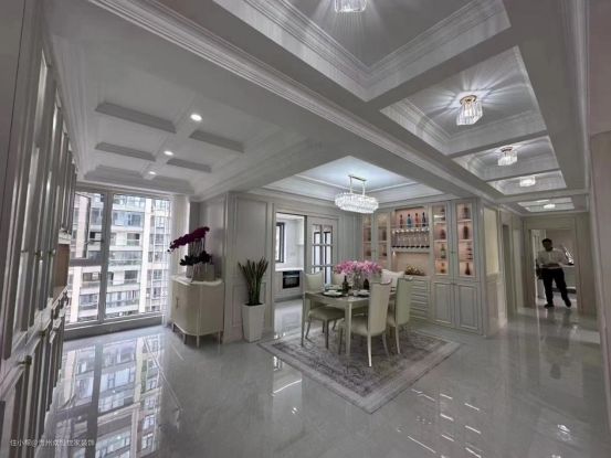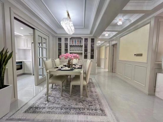 餐厅吊顶采用石膏线条搭配长方形的水晶吊灯,营造出优雅烂熳的就餐环境,酒柜的构架淡化区域线条,同时又具有法式独特的古韵感。