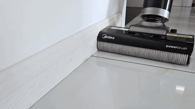 此外延边清扫也是一个痛点问题,美的GX5Pro针对这一点同样做了优化,它的机身和滚刷贴边设计做的非常好,可以看一下工作中滚刷和墙缝的贴合度,表现非常好,具体清洁效果后面也会进行测试。