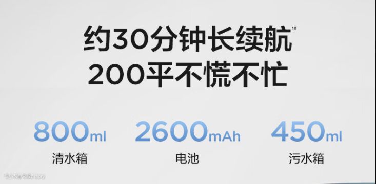 清水箱800ml、污水箱450ml,电池容量2600毫安。
