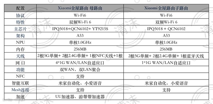 此外小米全屋智能路由器还支持WIFI6技术,支持满血160MHz大频宽,此外还内置了一些降低其它信号路由器干扰的BSS Coloring协议、 支持多设备同时数据发送,降低延迟的OFDMA协议,及Beamforming、WPA3及IPv6技术协议。加上256MB和128MB的大内存,子母路由器最高可支持连接256台设备。
