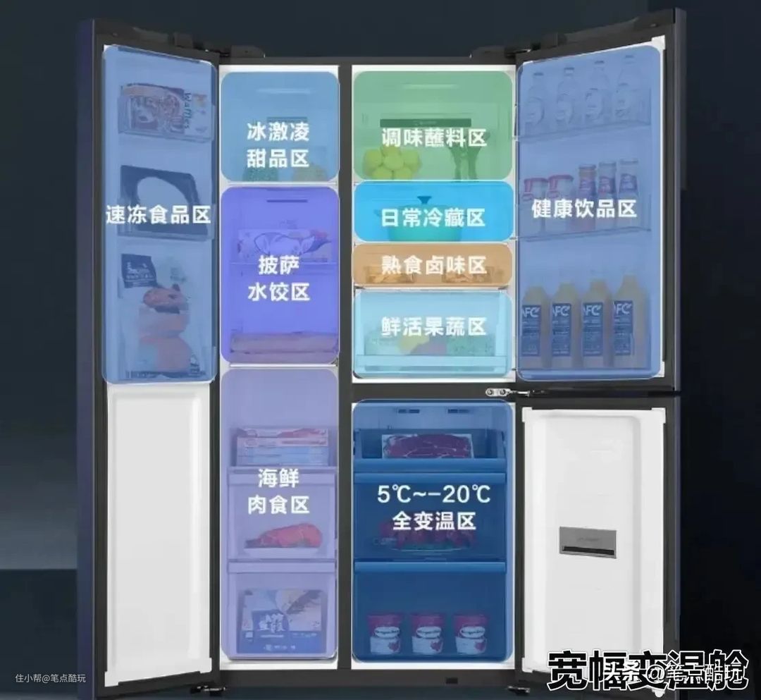 如果说多循环独立精确控温是一大优势,那么宽幅变温技术可以极大地增加冰箱实用性,满足多用途保鲜(鲜活保湿舱),让多个分区舱室都可以自由控温,随意设定从-20℃冷冻到5℃冷藏,双开门大空间、存储食物量大的冰箱尤其适用。大家需要注意的是分辨虚假的“宽幅变温”,冷冻温度达不到零下18度可以无视。