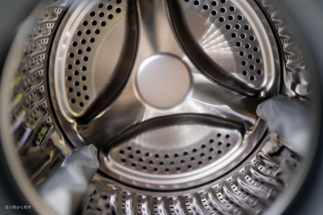 打开门洗衣机舱门后发现其采用碗型双层玻璃隔热、金属铰链,可以说在细节上毫不缩水。