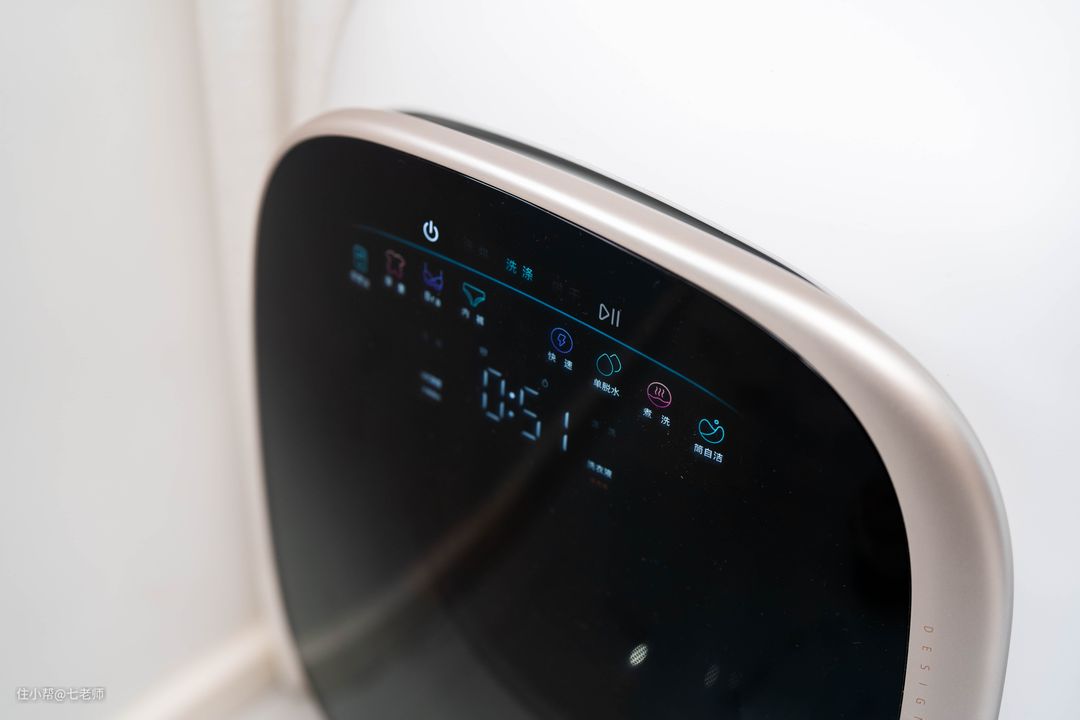 控制面板和洗衣舱门为一体设计,巨大的黑色有机玻璃面板极具质感,关机时非常深邃,石头的英文名称位于黑色面板下方。