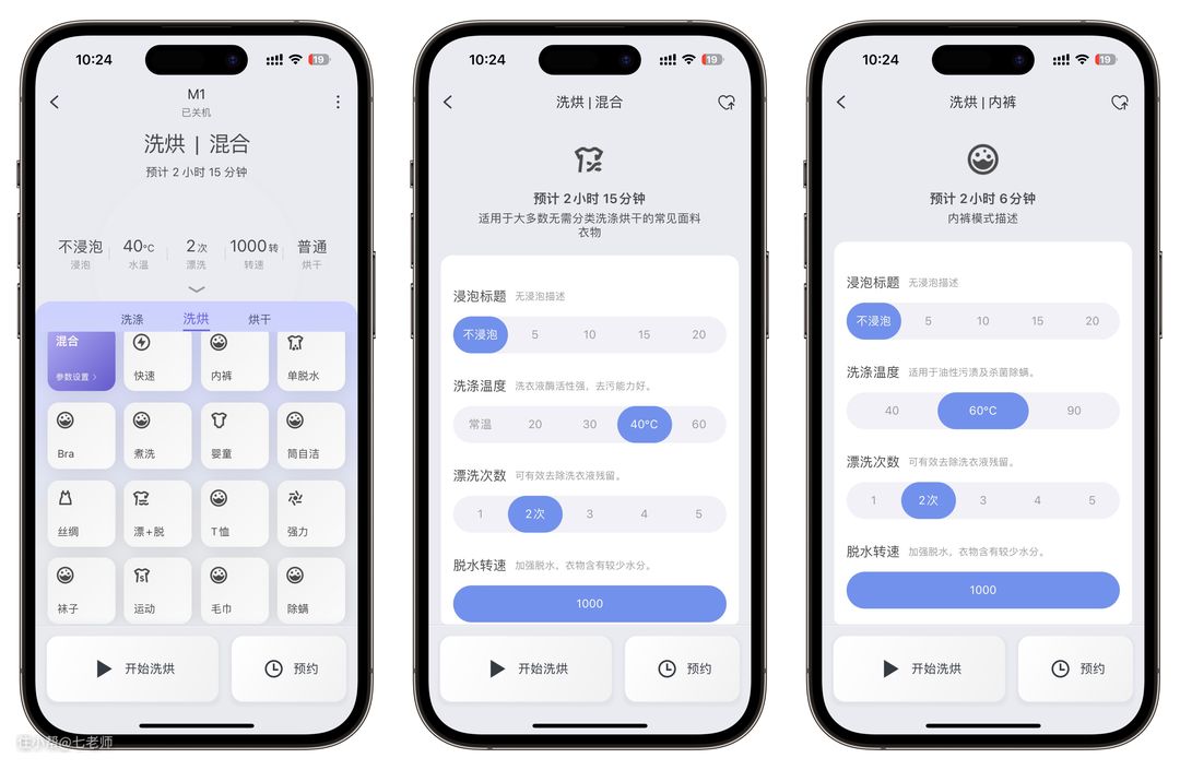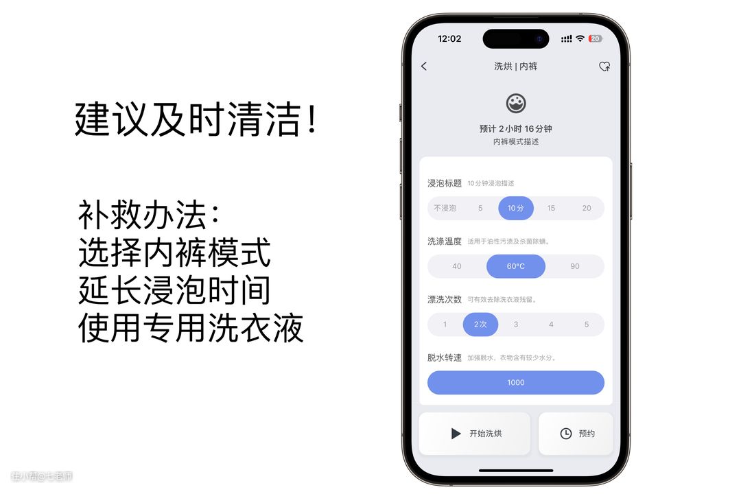 其他11种洗护模式(丝、漂+脱、T恤、强力、袜子、运动、毛巾、除螨、特渍洗、防过敏、小件)可从APP中调出,而且每一种模式中还能独立设置浸泡时间、洗涤温度、漂洗次数等,更丰富的洗护模式应用场景更多,除了清洗内衣裤,用来清洗毛巾等其他物品也非常方便。