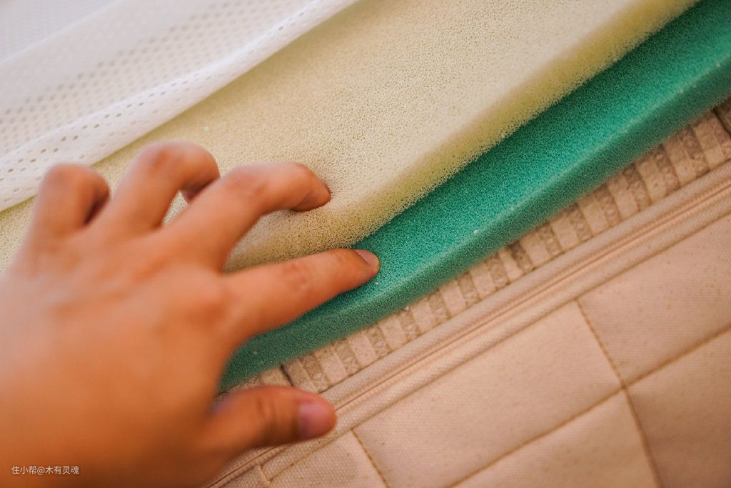 从产品质感来说,这次我摸到了两款不同的硅胶棉,上面这款浅色的更具备弹性,整体弹度大概在记忆棉和mini气泡簧这个水准,很Q弹;下面这款绿色的基本等同一般床垫的硬质支撑棉,睡感硬,组合起来作为基层和弹性层非常完美。缺点是因为结构导致手感没有一般海绵顺滑,但栖作本身填充层会有网布袋、顶层有面料层提升舒适度,这点小问题完全不会影响体验。