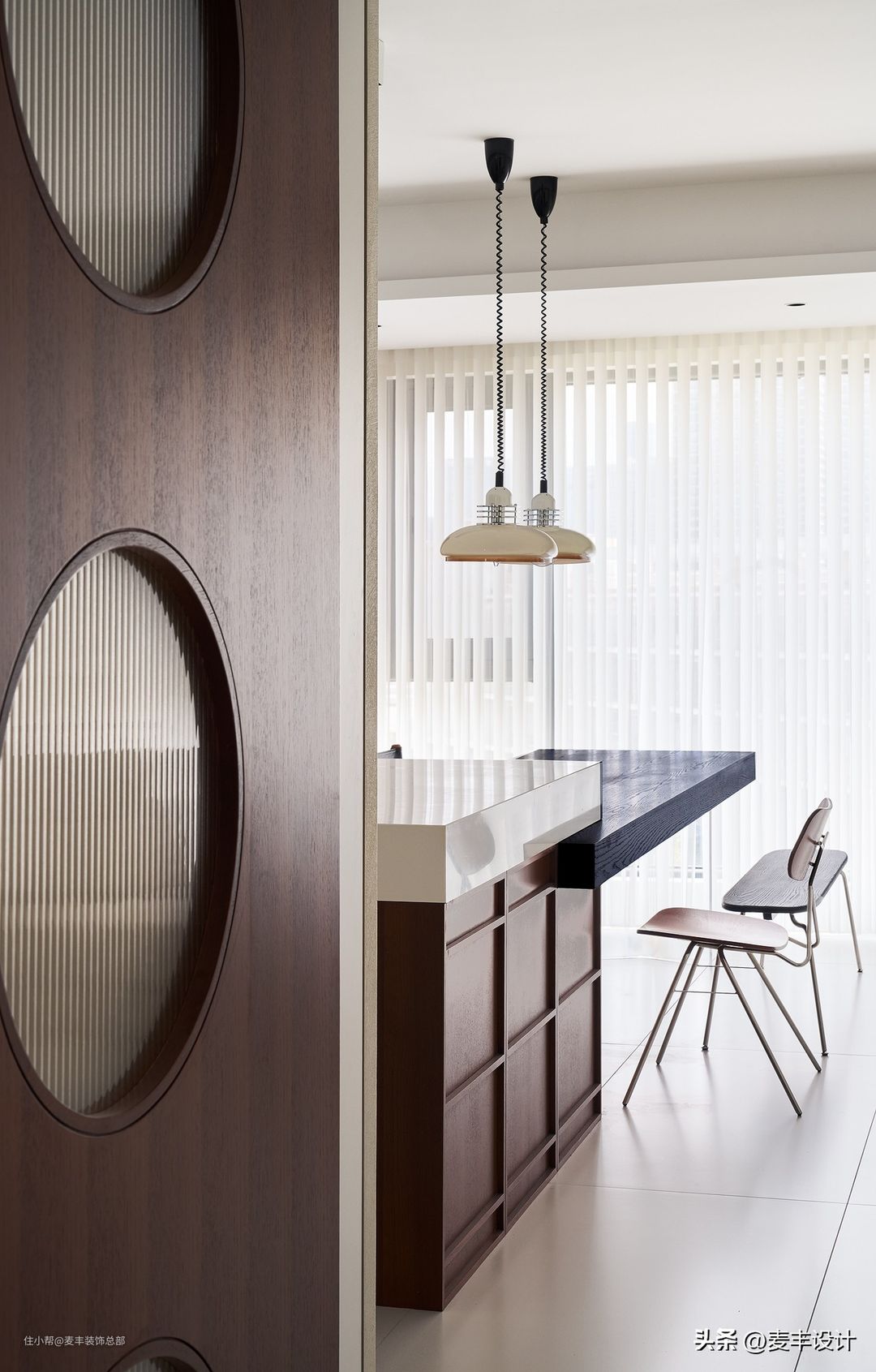 岛台+餐桌一体,节省使用空间,满足一日三餐的需要,中古风日式吊灯和独特的餐座椅也给餐厅多加了一点设计感。超长橡木黑餐桌既满足日常所需,也可以在这里和孩子互动游戏。