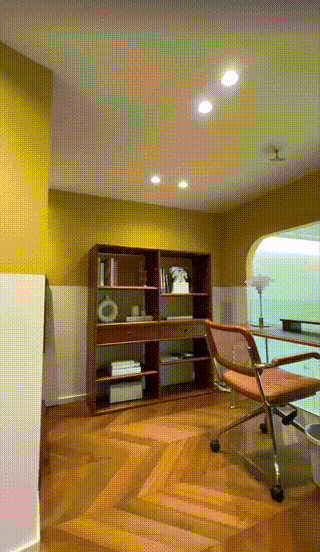 书桌面朝着落地窗,做了玻璃扶手,视野开阔,墙面做了半弧形的处理,让整个空间更有造型感。