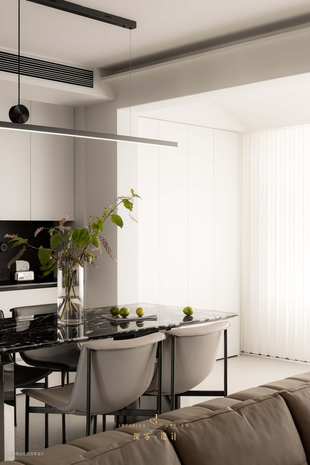 一字型沙发做隔断,其后就是用餐区,配套餐桌椅独立成区,常坐8~10人还是不成问题的,餐边柜二分段式,黑白对比,中间台面可使用各种小家电,提前预留好了可移动式轨道插座,预算充足的可以多装一个壁挂式饮水机。
