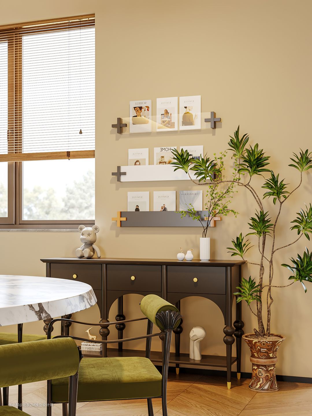 4.树枝摆件作为装饰品,增加了用餐区的自然氛围。白色和木色餐边柜的选取,给人一种简约又雅致的感觉,与欧式风格相得益彰。