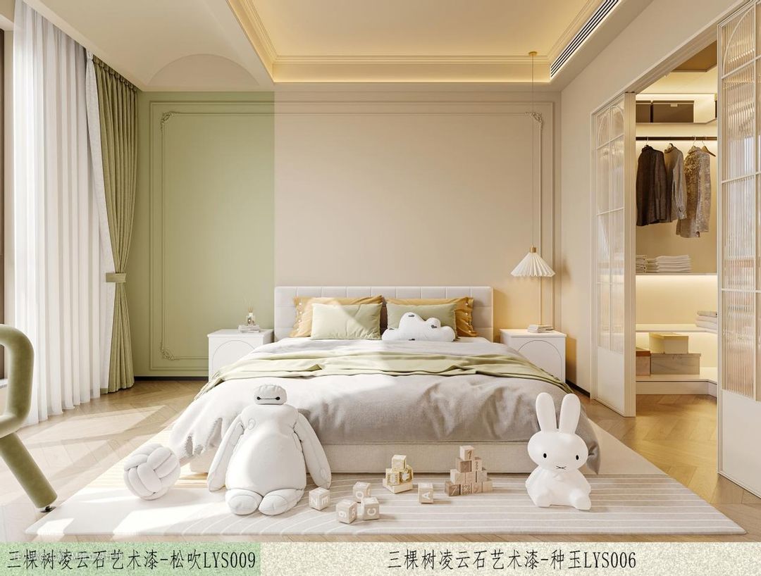 1.女儿房采用了温馨的配色,以米色和青绿为主要色调。床头背景墙同样使用了更为环保的艺术漆,米灰色调的是“三棵树凌云石-种玉LYS006”,素雅柔和,低饱和的青绿色是“三棵树凌云石-松吹LYS009”,如劲松般苍翠,给卧室增添一丝青春活跃的气息,拼色设计搭配欧式线条,整体营造出舒适的氛围。三棵树凌云石触感细腻平滑,细看有多色渐变彩点,其名字寓意“少年壮志凌云”,而且非常耐擦洗,日常污渍一擦就掉,很适合用在孩子的卧室。