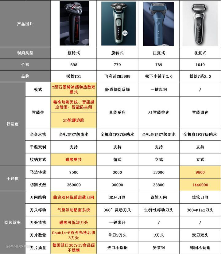 这里给大家对比了市面不同客单价的剃须刀产品的刀头&马达数据,可以自行对比一下: