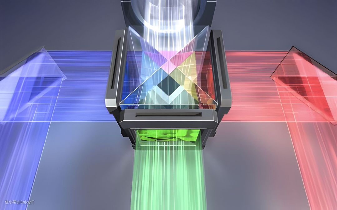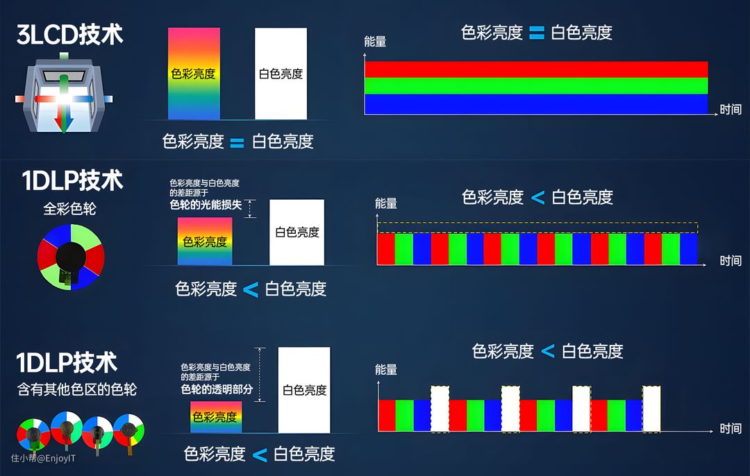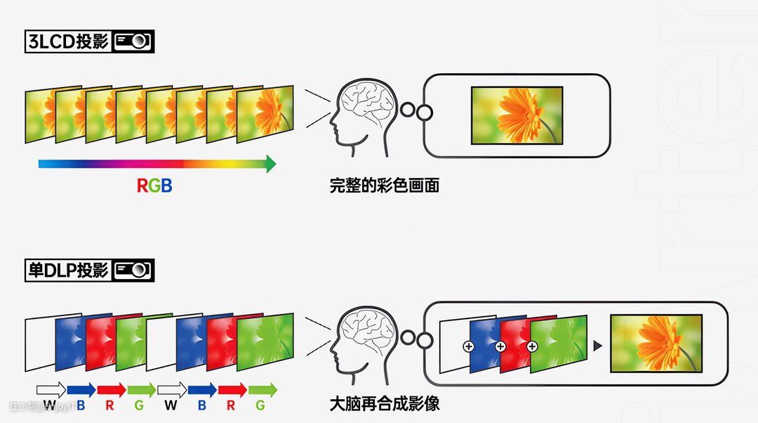 先说专业投影玩家热衷的3LCD投影,相比常见的DLP方案最大的优势除了有更好的光能利用,还在于3LCD方案采用三片式成像、能同时处理三原色并实时生成更具真实色彩的画面。而DLP方案需要通过色轮折射再通过DMD来反射,利用人眼的视觉停留效应脑补生成画面,因为原理性限制,有彩虹现象。但市面上走量的国产智能微投用的还是DLP方案,成本低是一方面,还因为3LCD方案无论在色彩表现、光源控制、还是成像技术、温度控制等各方面都有较高的技术门槛。